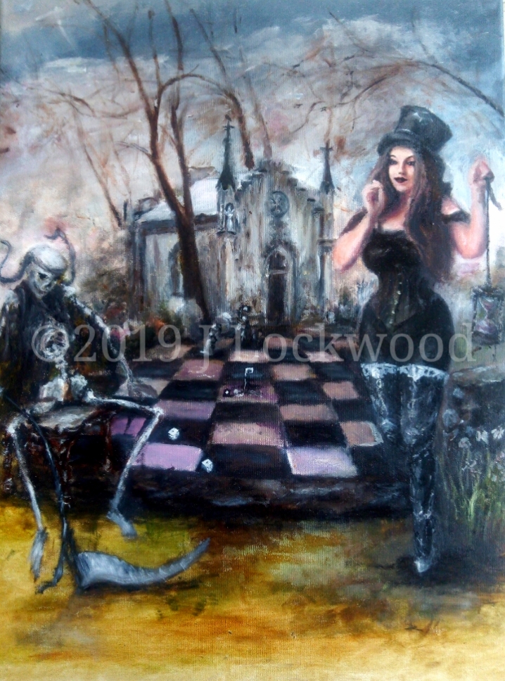 Death and the Maiden play a game for souls as a miniature chess match takes place behind them. It's good to be the king, but Death isn't him. The Maiden smiles as she watches time run out while Death decides his next move. Who will be saved? Maiden is based on Mary Karol, singer for gothic metal band Fairie's Death Waltz.